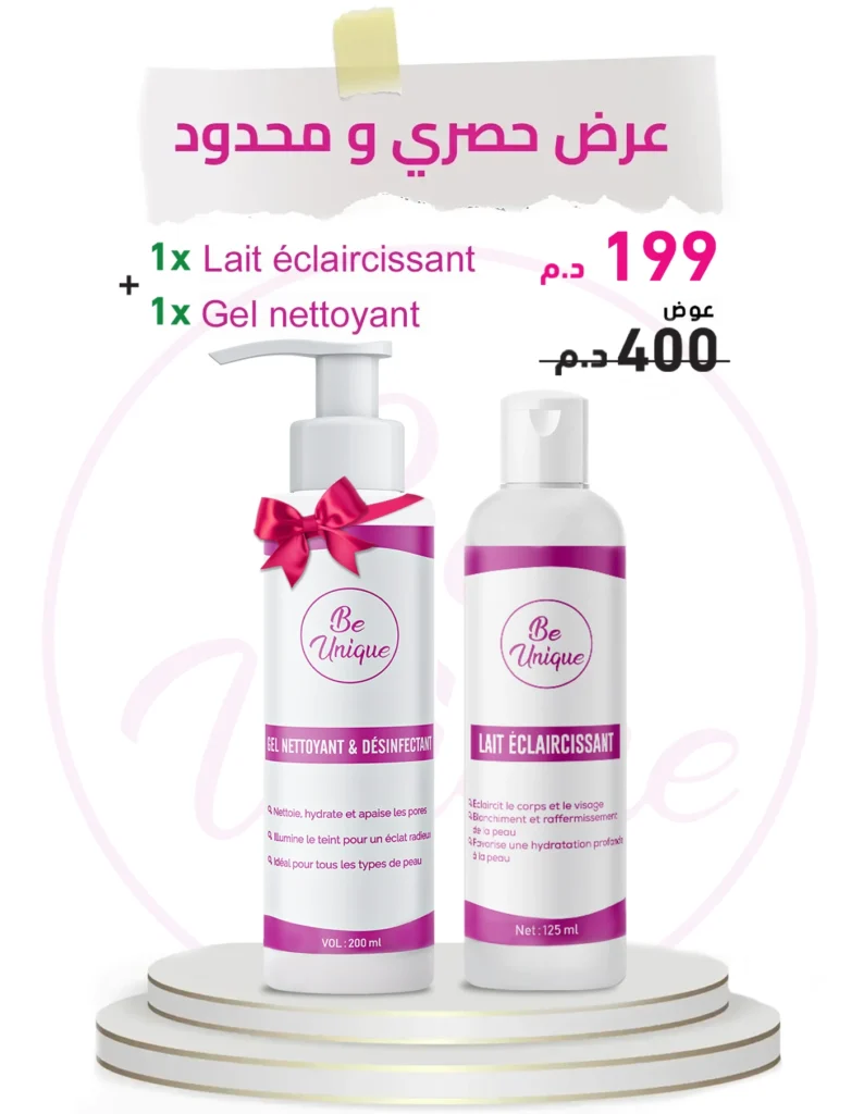 1x Lait Éclaircissant + 1x Gel Nettoyant à 199 DH (Promotion)