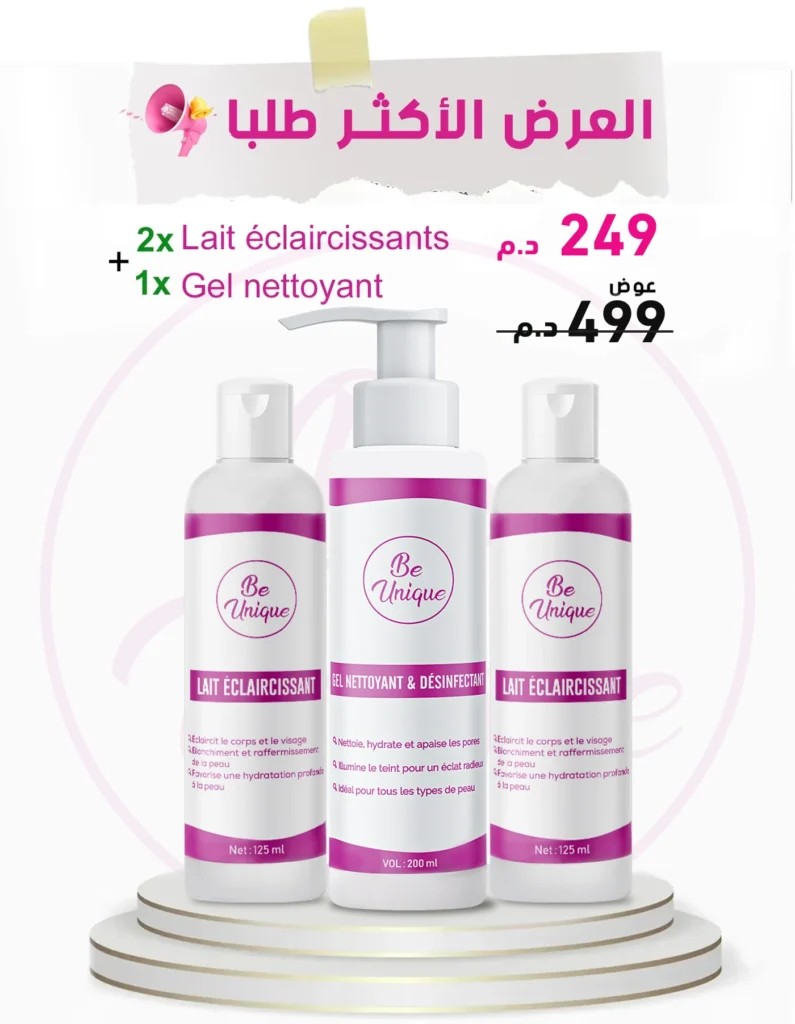2x Lait Éclaircissant + 1x Gel Nettoyant à 249 DH (Promotion)